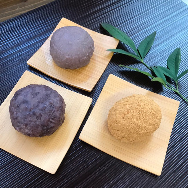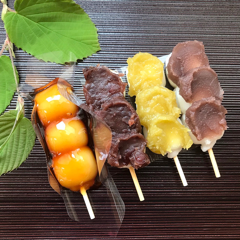 きなこ、粒あん、うぐいすあん、みたらしの4種類の味が楽しめます。