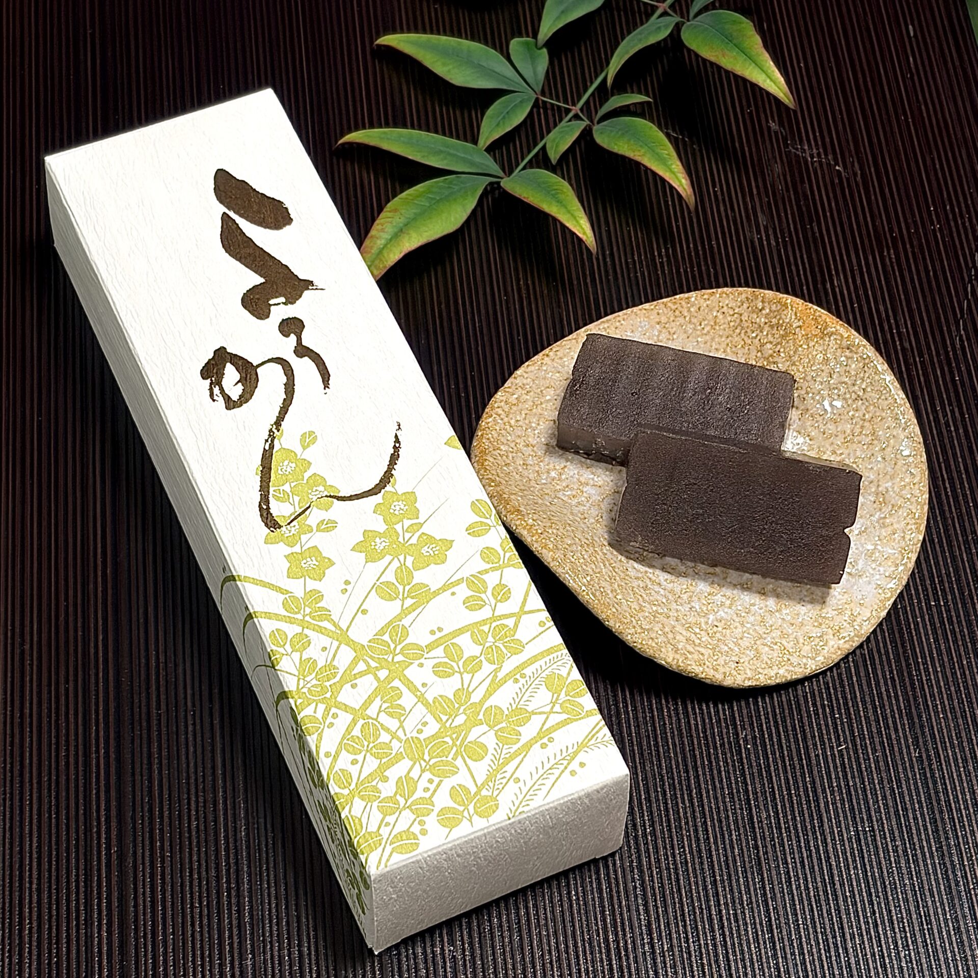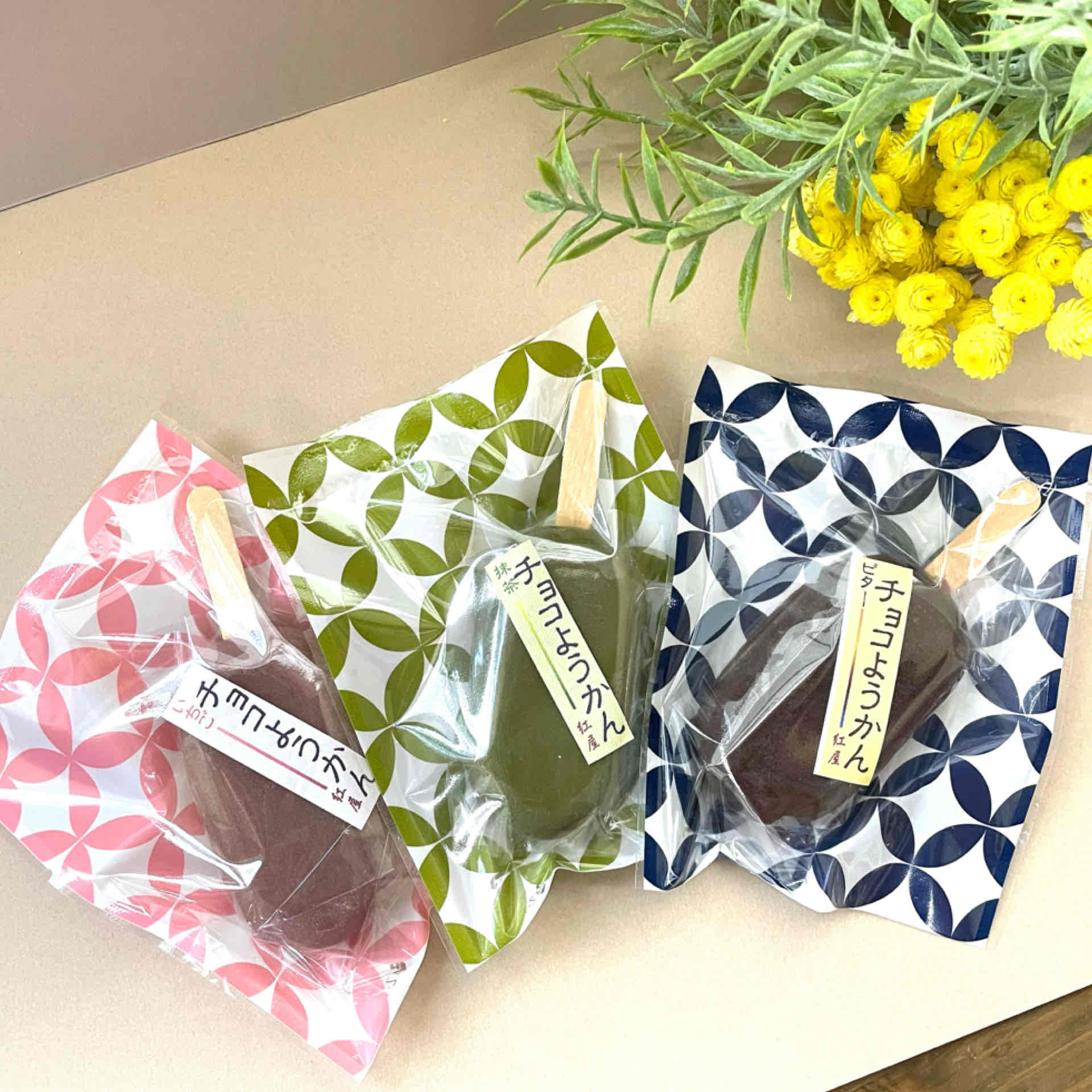 羊かんにチョコレートを練りこんだ、食感は羊かん口どけはチョコレート、2つの特徴を合わせるととてもおいしいお菓子になりました。棒付きなので切る手間もなく食べやすく大好評です。