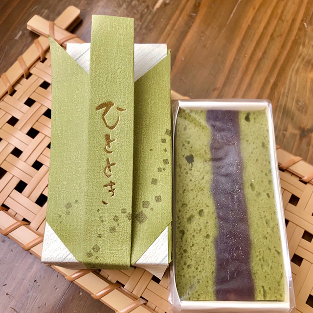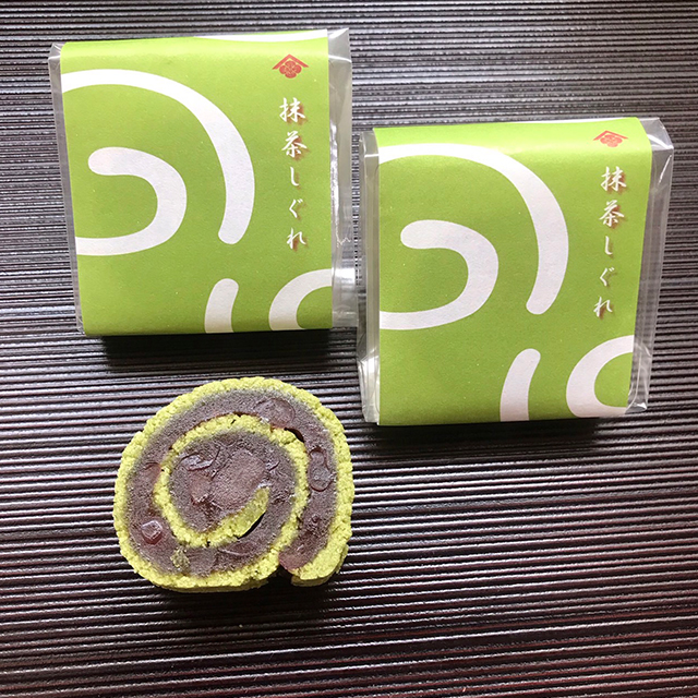 抹茶そぼろを広げ小倉羊かんを巻き込んだうず巻き状の蒸菓子です。