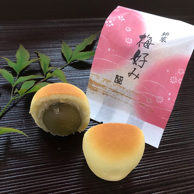 青梅の蜜漬けを包んだ桃山のお菓子です。梅の甘酸っぱさが上品に広がり桃山の黄身あん