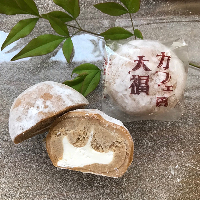 中心の生クリームが甘すぎず、コーヒー餡のほろ苦さがちょうど良い大福です。