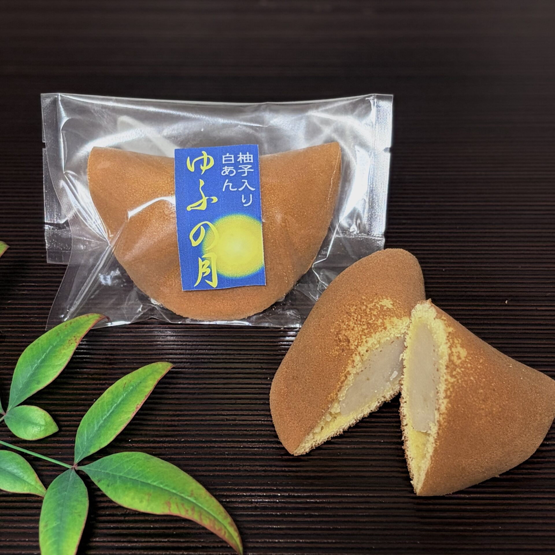 柚子皮入りで風味の良い白あんを丸く焼いた生地にのせ半月に折りたたんで包んだ焼菓子です。歯切れのよい生地がくせになります。